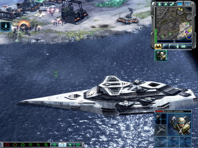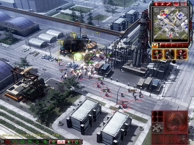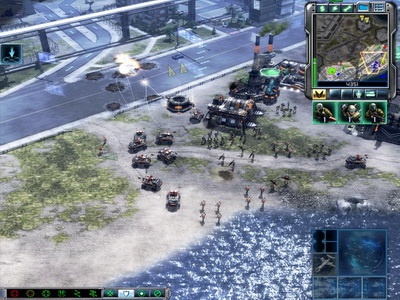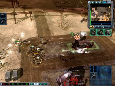 La gestion est super simple : bâtiments, véhicules, ressources et même comportement se configurent en quelques clics de ces petites choses qui le rendent plus complet et stratégique. Par exemple si on double-clique dans le menu des actions (qui un peu encombrant à mon gout) sur un corps d'armées, tous les gars du même type seront sélectionnés. Plus stratégique, on peut entrer dans certains bâtiments pour s'en servir de points de défense, on peut toujours capturer les bâtiments adverses pour les revendre ou avoir de nouvelles fonctions, il y a toujours la fabrication de véhicules roulants ou volants, et le choix de faire certaines missions secondaires. Si on ne peut pas échapper aux missions primaires, les missions secondaires sont à conseiller comme par exemple libérer une base aérienne pour avoir ensuite un soutien par les airs. Avec tout ça on retrouve bien sûr les soldats habituels de chaque camp (grenadiers, mitrailleurs, lance-missiles, tank mammouth) avec toujours des lance-flammes (tanks ou mercenaires) bien sadiques et rageants, ainsi que la possibilité de leur insuffler une ligne de conduite. Car nos bonhommes se déplacent souvent vers l'ennemi, ils vont au contact, ce qui pourra rebuter dans un premier temps (ils vont généralement au casse-pipe) mais qui s'avérera compréhensible. Il est d'ailleurs à signaler que les troupes du GDI sont assez dociles, là où celles du NOD n'en font souvent qu'à leur tête. En fait, on a 4 types principaux de comportement : agressif (nos hommes attaquent tout ce qui bouge), défensif (ils garderont au maximum l'endroit où ils sont), planification de tâches (pas besoin d'expliquer je crois) et mode parcours (pour qu'ils suivent un chemin qu'on prédéfinit). Y'a de l'idée. Avec tout ça, nos hommes peuvent prendre du galon (ainsi ils sont plus puissants, plus efficaces), on peut les soigner (ou réparer les véhicules endommagés) et on retrouve avec plaisir quelques missions commando toujours aussi "Ramboesque" (et d'la main gauche ! :). Personnellement, je joue sur le surnombre pour l'emporter mais chaque carte (qui ne sont que moyennement grandes) possèdent plusieurs types d'approches et autant de façon de faire.